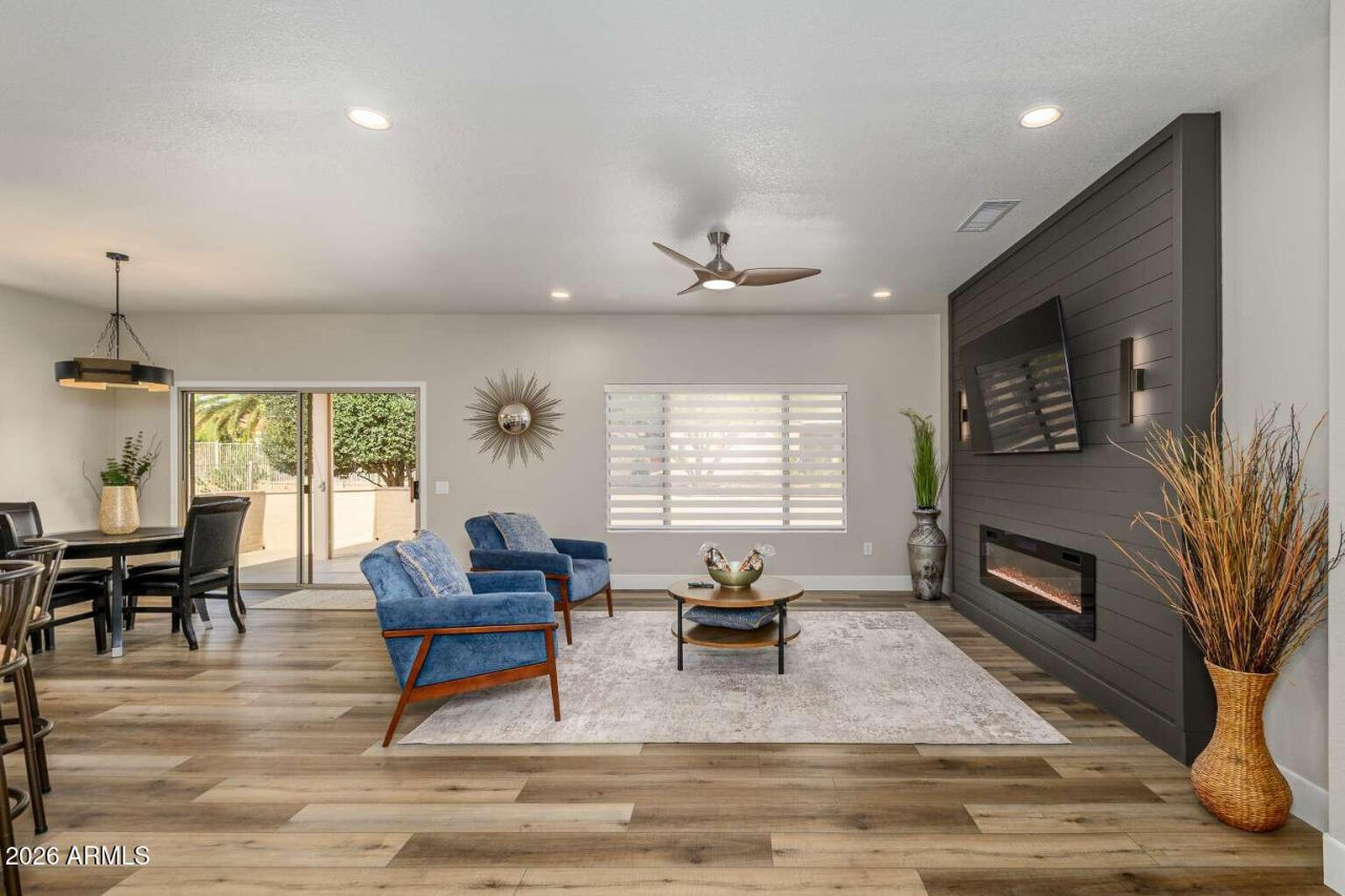 You wont find one like this in The Grand (45+ community). This stunning, completely remodeled Acacia model boasts a full exterior paint, over $3k in new beautifully landscaped bushes and irrigation on a massive lot w/plenty of room for a pool. Step inside this wonderful turnkey home to discover a modern kitchen featuring quartz counters, a stylish backsplash, stainless steel sink and faucet, soft close cabinet doors, and top-of-the-line LG stainless steel appliances. The brand new washer and dryer add convenience to your daily routine. The home is illuminated by 12 new recessed lights (with dimmer switches throughout the home) and showcases an amazing media wall with a linear fireplace, two sconce lights, and a new 65 LG TV. Enjoy the comfort of matching WiFi-controlled ceiling fans throughout. New 6 baseboards add a touch of elegance, and a dining room chandelier provides a focal point for gatherings. Experience luxury with high-end LVP flooring throughout the home. The master bath is a true retreat, completely remodeled with large 24x48 calacatta polished tiles, a large niche, a glass shower door with brushed bronze hardware, a Delta brushed bronze shower head, a new double sink vanity with brushed bronze faucets, and a new vanity light. The home features new high-end door hardware and interior paint throughout. The master bedroom includes a GeoAccent wall, and custom fit zebra shades throughout the home offer privacy and style. An extended 2 car garage with a poured concrete ramp provides ample space for a golf cart in front and a full-sized vehicle behind it for added convenience. Enjoy mountain views from the back covered patio, which also includes a half wall and two gates for pet security. Located on a great circle with quick access to Bell Road, this home offers convenience and community. A walking trail entrance at the end of the circle leads to a huge green space park, perfect for pets and outdoor activities. Dont miss the opportunity to own this exceptional property!